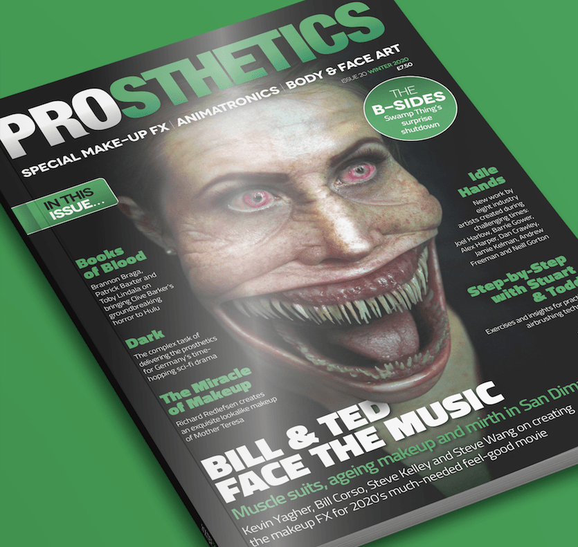 It’s been a longer wait than usual for the new issue of our favourite magazine but it was definitely worth the wait – issue 20 is here and it’s a brilliant read!In it you’ll find muscle suits, makeup FX and mirth on Bill & Ted Face the Music, wonderful new prosthetic work by industry artists created in the challenging times we’re living in, the complex task of creating the prosthetic FX for German sci-fi series Dark, the coming of age of The Prosthetics Event with its move to Ricoh Arena, the Swamp Thing TV series characters that fell victim to a surprise shutdown of filming and the creation of the hard-hitting prosthetics in Hulu’s Books of Blood.Stuart Bray and Todd Debreceni give us exercises and insights with which to practice airbrushing techniques in the concluding part of their primer Airbrush-101, Hollywood makeup FX artist Richard Redlefsen creates a stunning lookalike makeup of Mother Teresa on his wife Anna, and Academy Award-winner Joel Harlow gives us some Words of Wisdom as well as taking us through the build of 8 brand new pieces of work created during the unheard-of industry downtime of the 2020 pandemic quarantine.The cover image is Samantha Gardiner as Needle Face Mom in Books of Blood (Hulu, 2020). Prosthetic makeup designed by Toby Lindala, sculpted by Erin Peters, applied by Toby Lindala and Patrick Baxter – love this crazy character!Buy or subscribe to the magazine here