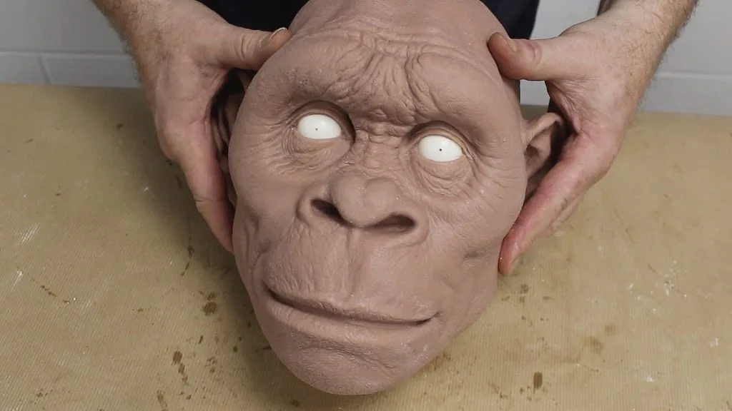 Casting the Homo Habilis bust in silicone from a silicone mould using a soap release agent. The silicone is applied using a brush-up method and backed with a rigid fast cast PU resin.